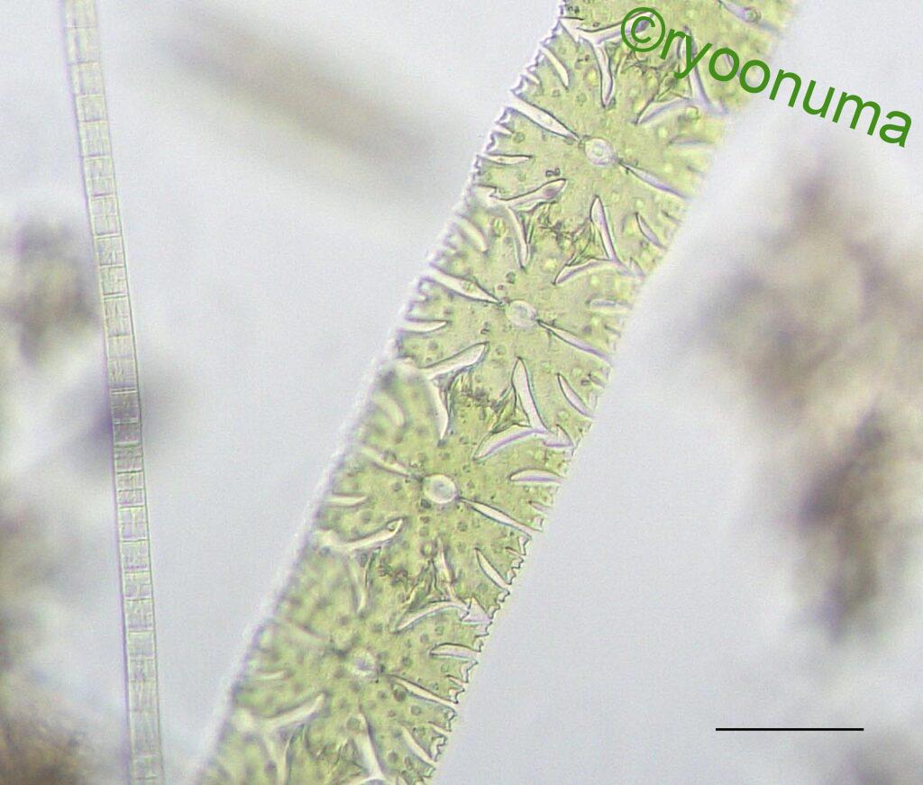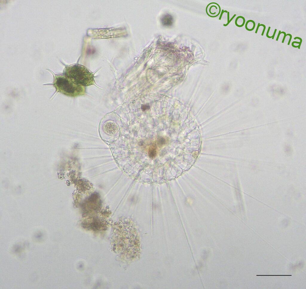 この池は、私が見た池の中でもいろいろな生物がいる池で、図鑑でしか見たことがなかった藻類も発見できて、とても良いサンプリングになりました。下の写真は見つけた生物の一部です。右下の黒い棒(スケールバー)は50 μmを表します。キャンパスから近いので、他の季節にも行ってみたいと思います。